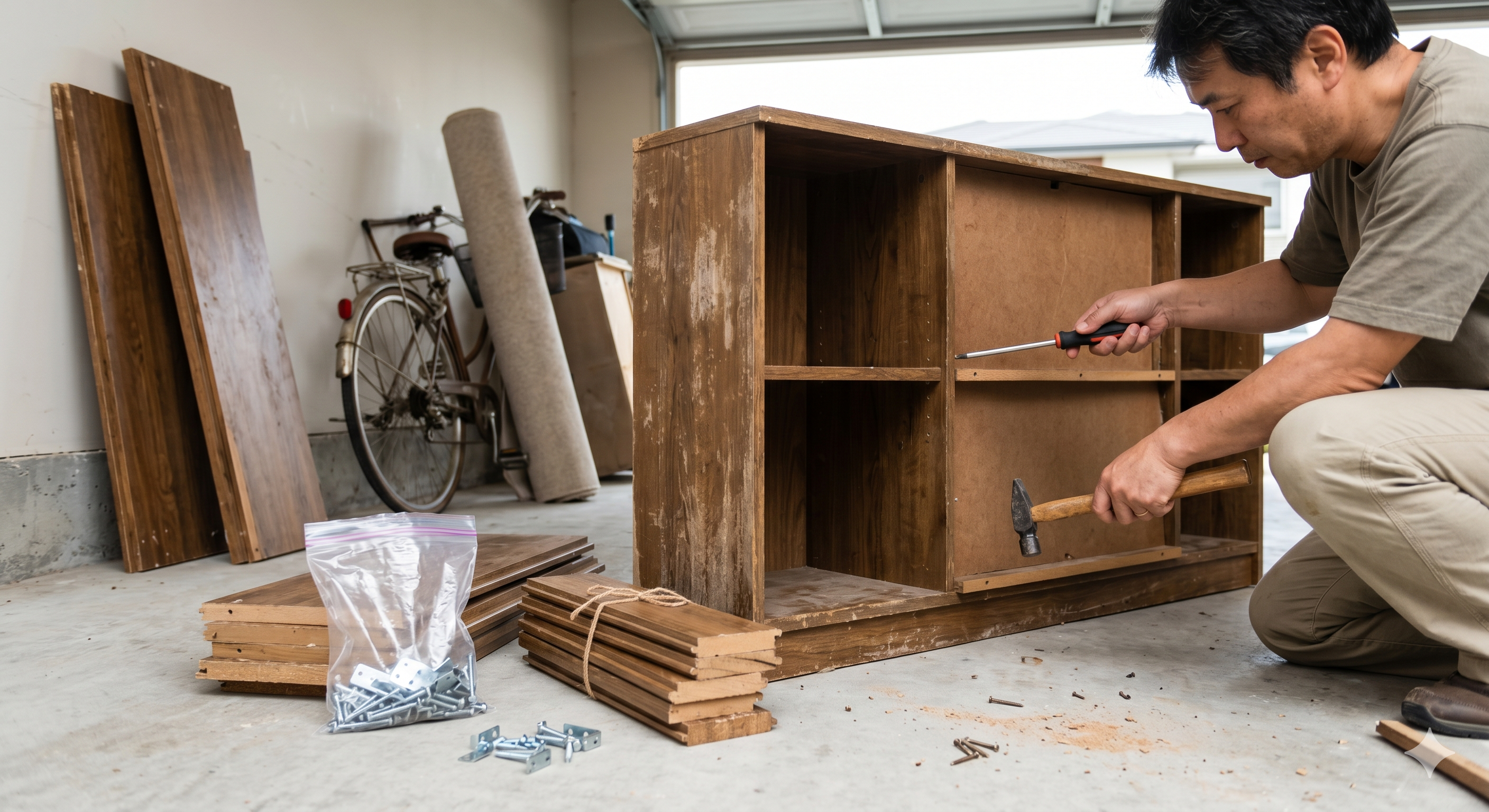 いきなり本体を壊そうとせず、まずは棚板、脚、扉、引き出しなど、取り外せる部品から外していきます。先に付属パーツを減らすことで、本体の構造が見えやすくなり、作業もしやすくなります。