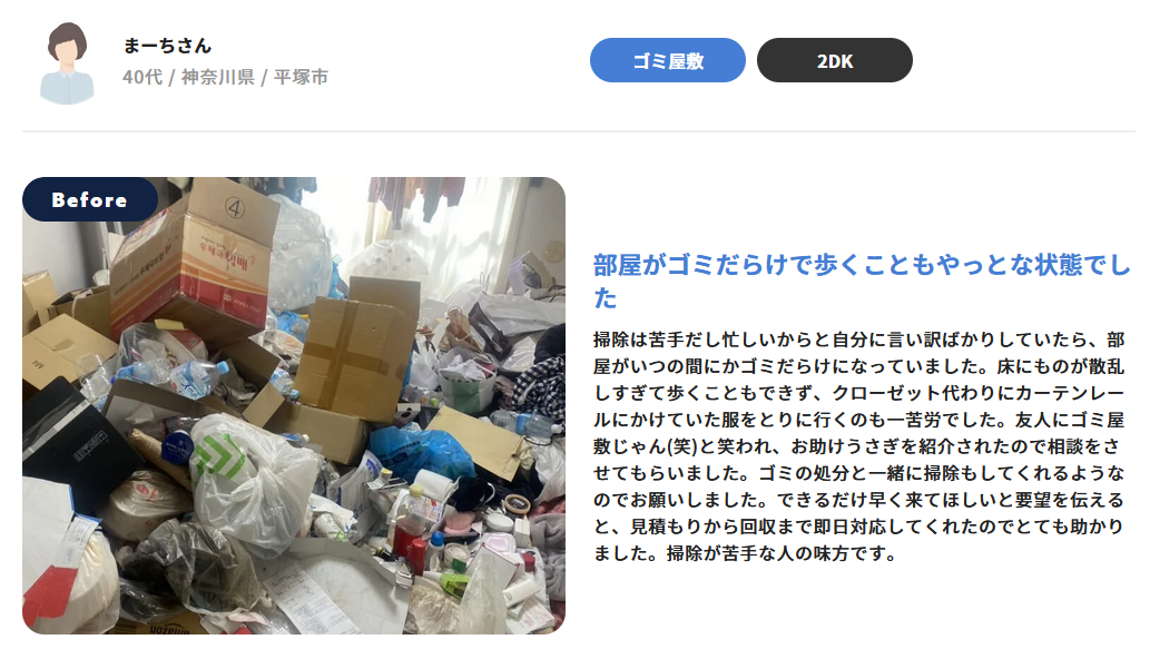 | サービス | ゴミ屋敷の片付け、女性スタッフによる汚部屋の片付け、不用品買取、ハウスクリーニング・リフォーム、遺品整理、生前整理、各種手続き代行、仏壇クリーニング、特殊清掃、解体工事、不動産整理、引越しサービス、家具組立・移動サービス |