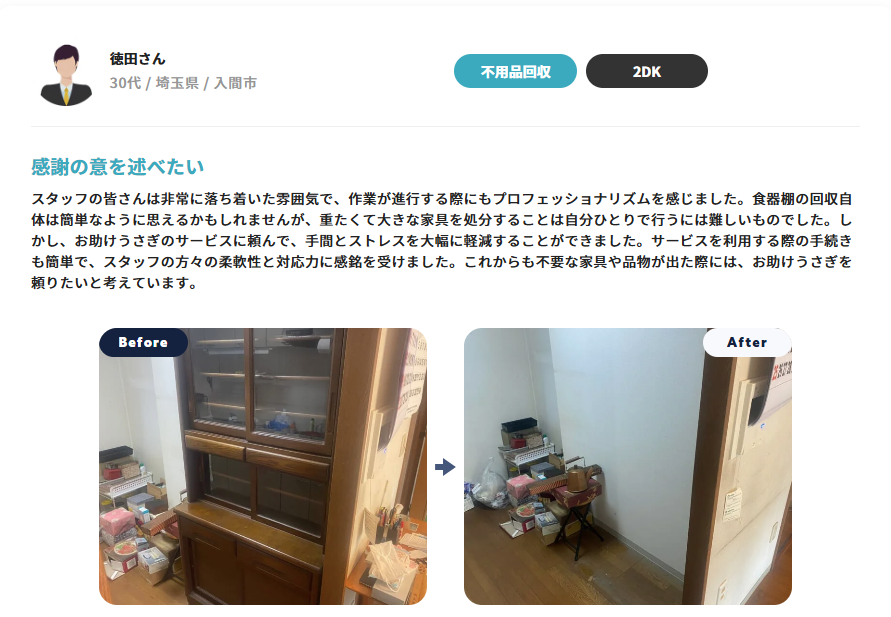 お助けうさぎを信頼しており、今後も何かあれば迷わず依頼しようと考えています。お助けうさぎの皆さん、本当にありがとうございました!