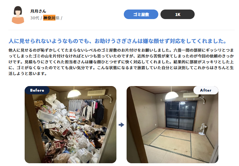 お助けうさぎはゴミ屋敷の片付け・清掃のプロとして迅速かつ丁寧に対応いたします。相模原市であれば即日対応も可能です。女性スタッフ同伴や対面不要での片付け作業など様々なニーズにもお応えします。