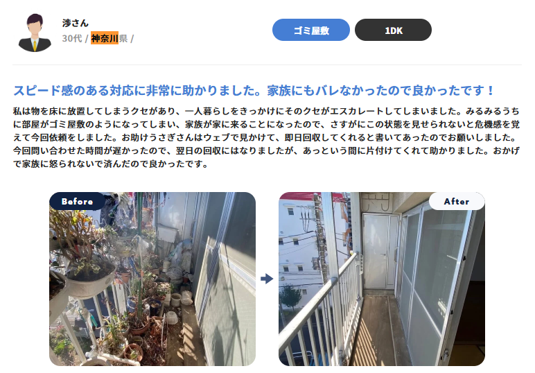 遠方に住む高齢の親の家が、物で溢れかえっていると近所の方から連絡がありました。久しぶりに帰省してみると、想像以上のゴミ屋敷状態で愕然としました。体も弱ってきている親には片付けは難しく、私たち夫婦だけでやろうとしましたが、あまりの物の多さと分別の大変さに途中で断念。途方に暮れていたところ、ケアマネージャーさんからお助けうさぎさんを紹介されました。見積もりから作業完了まで、とても丁寧に対応していただき、貴重品なども気にかけて探してくださったので安心してお任せできました。長年手つかずだった家が綺麗になり、親も喜んでいました。本当に感謝しています。