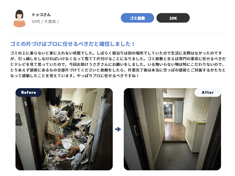 現場ビフォーアフターの公開ページでは、作業前と作業後の写真をご覧いただくことで、実際のゴミ屋敷の片付け実例を見ることができ、どのような成果が期待できるのかを視覚的にご理解いただくことができます。