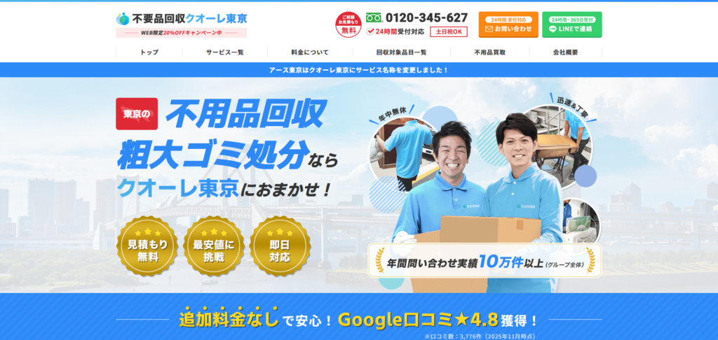 2025年11月4日に「不用品回収アース東京」という名称から「不用品回収クオーレ東京」に変わりました。株式会社クオーレの公式サイトや各社のプレスリリースにて発表があり、運営しているサービスの名称が全て「不用品回収クオーレ」に統一されています。