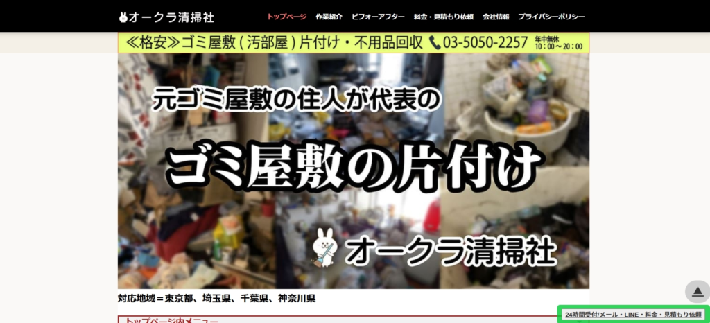 オークラ清掃社は、東京都および関東エリアで「ゴミ屋敷片付け・不用品回収・遺品整理」などをワンストップで提供できる専門業者です。代表自身の経験を活かした寄り添い力、女性スタッフ対応・買取サービス・明朗会計など、利用者にとって安心材料が多く、特に散乱物件や恥ずかしさを感じる片付け案件に強みがあります。